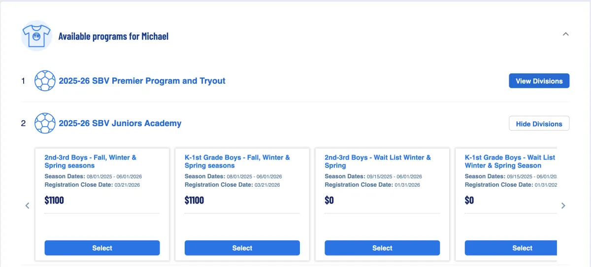 You'll see all the available programs for your player - select "SBV Juniors Academy" and select your session and location.